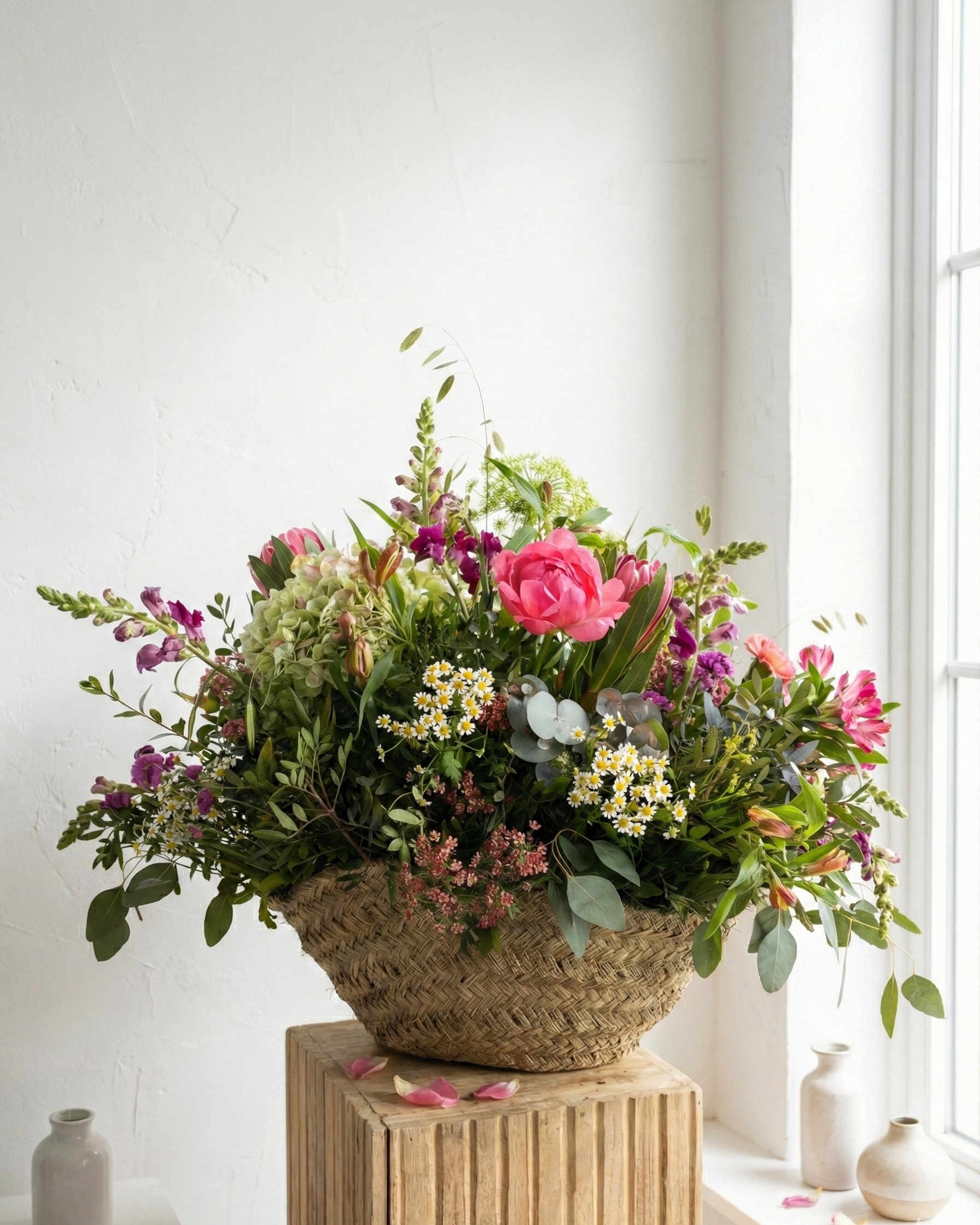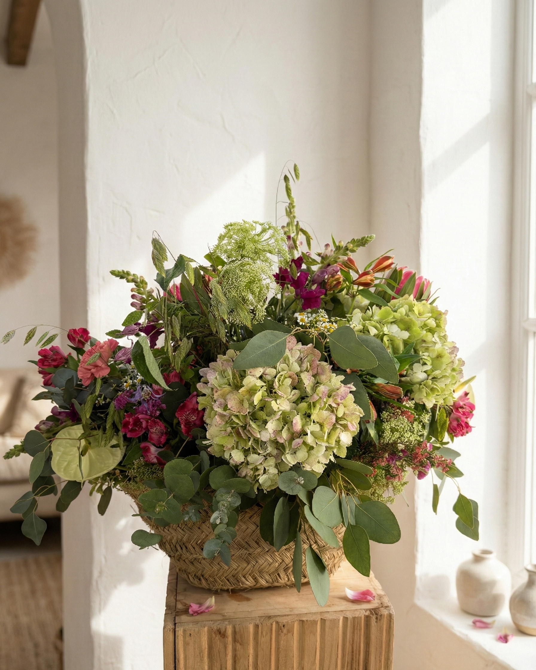 Cesta o capazo confeccionado con mezcla de flores frescas y verdes naturales. Las flores que utilizamos varían cada pocos días y según la temporada, pero siempre serán las más bonitas. Arreglo presentado en nuestros capazos hechos en España y de fibras 100% naturales.Escoge entre cuatro tamaños diferentes según la ocasión, y también tu tonalidad preferida.