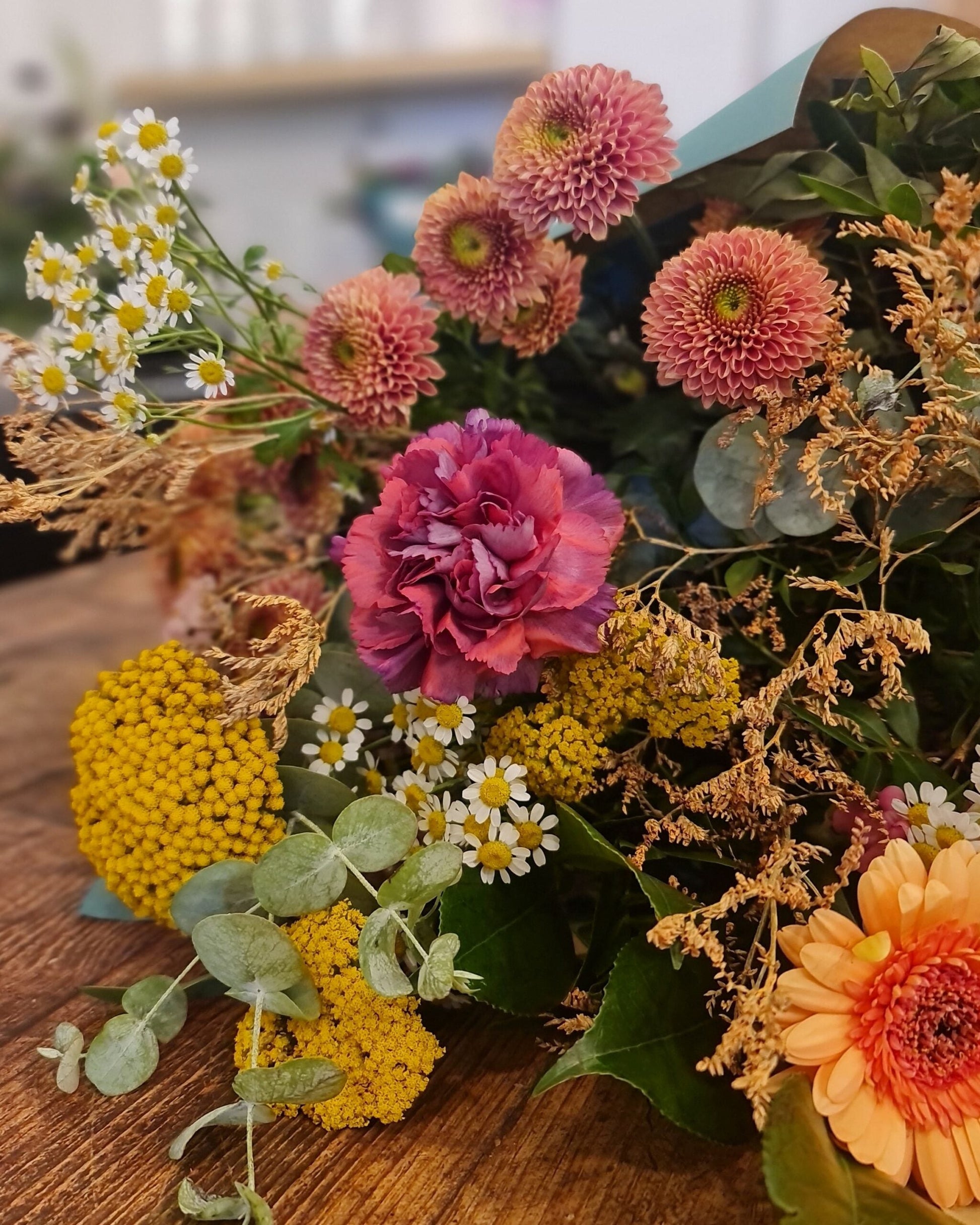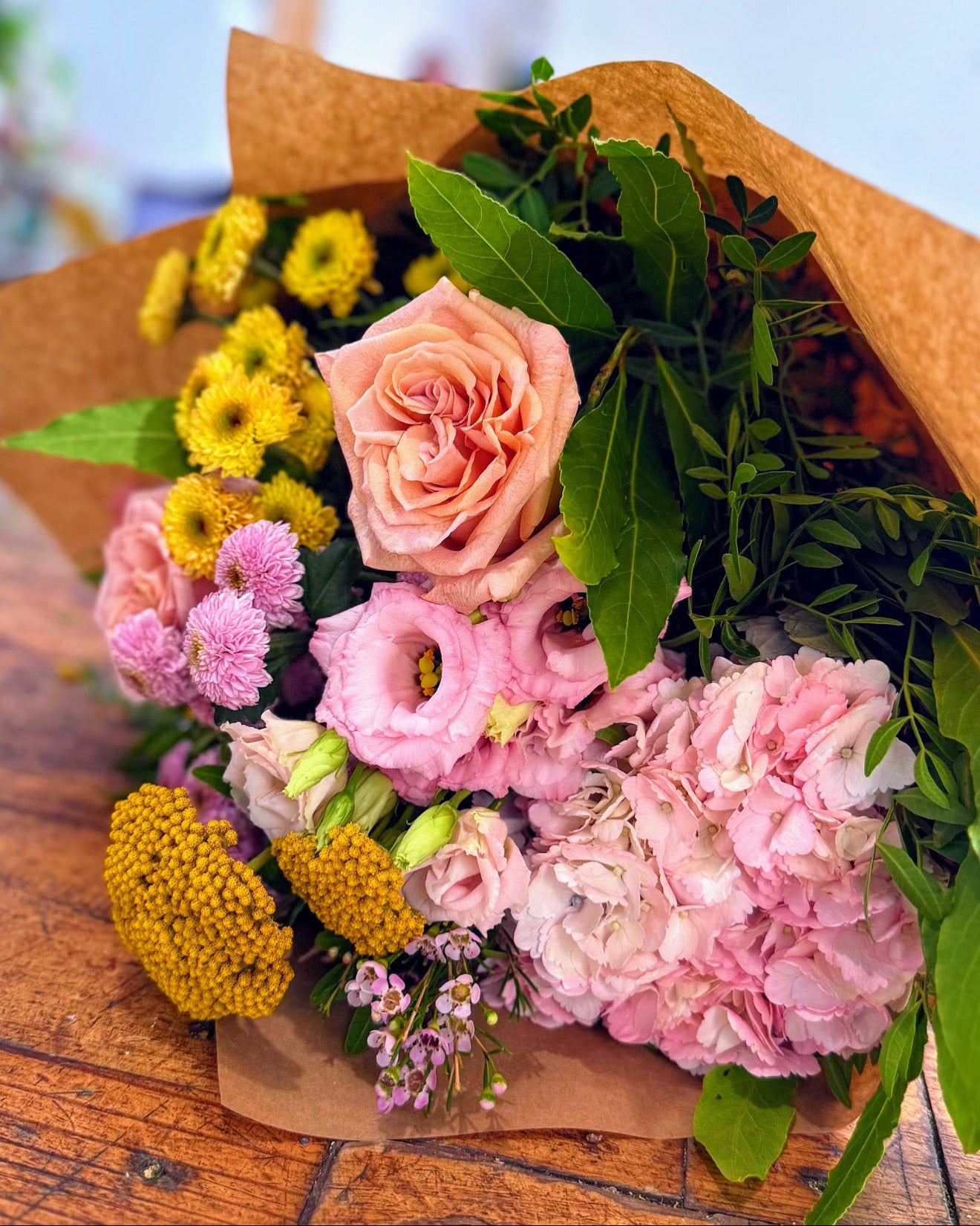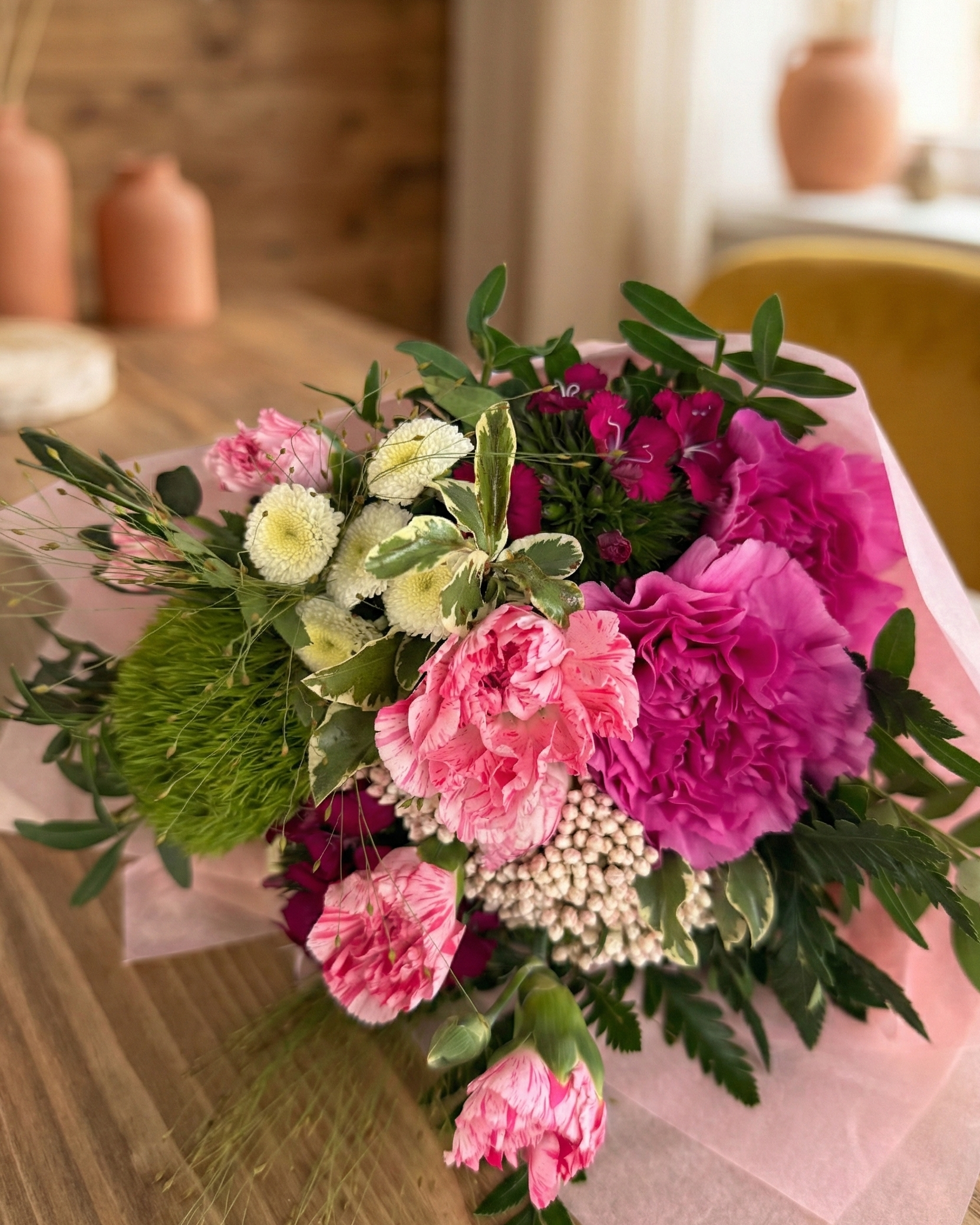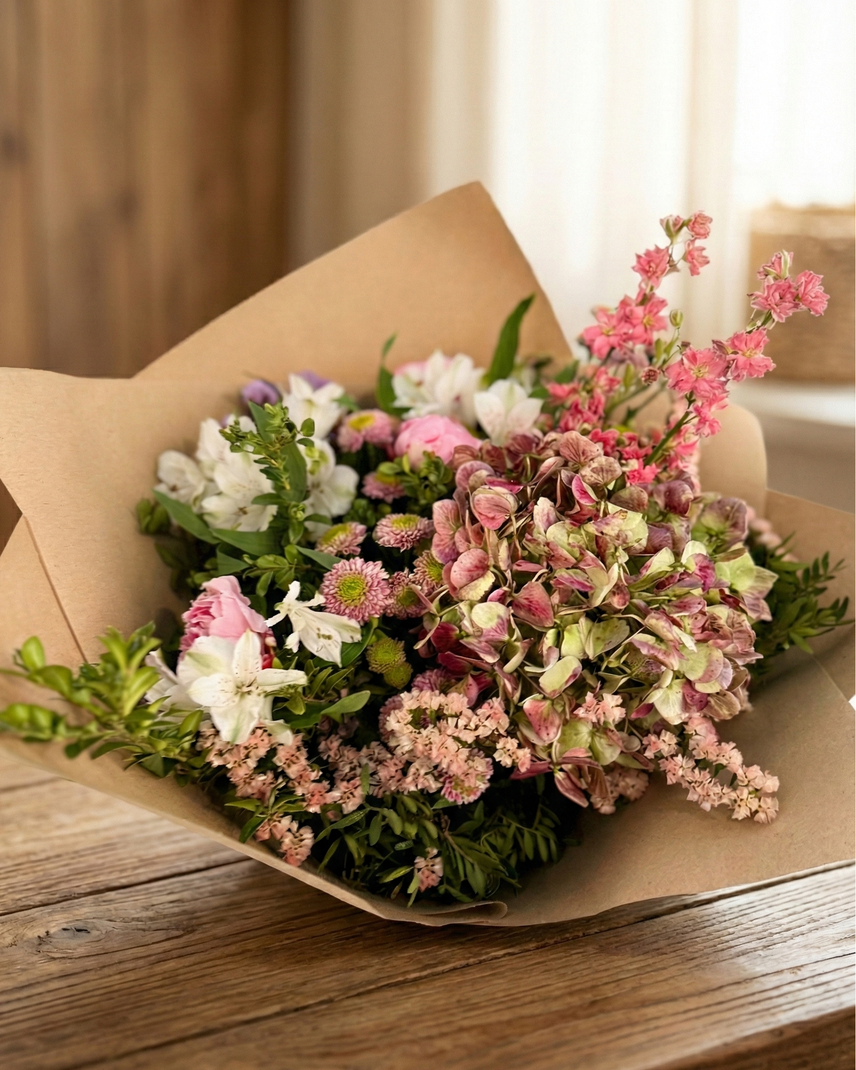 Ramo confeccionado con mezcla de flores frescas y verdes naturales. Las flores que utilizamos varían cada pocos días y según la temporada, pero siempre serán las más bonitas. Presentado en un precioso envoltorio de papel Kraft. Escoge entre cuatro tamaños diferentes según la ocasión, y también tu tonalidad preferida.